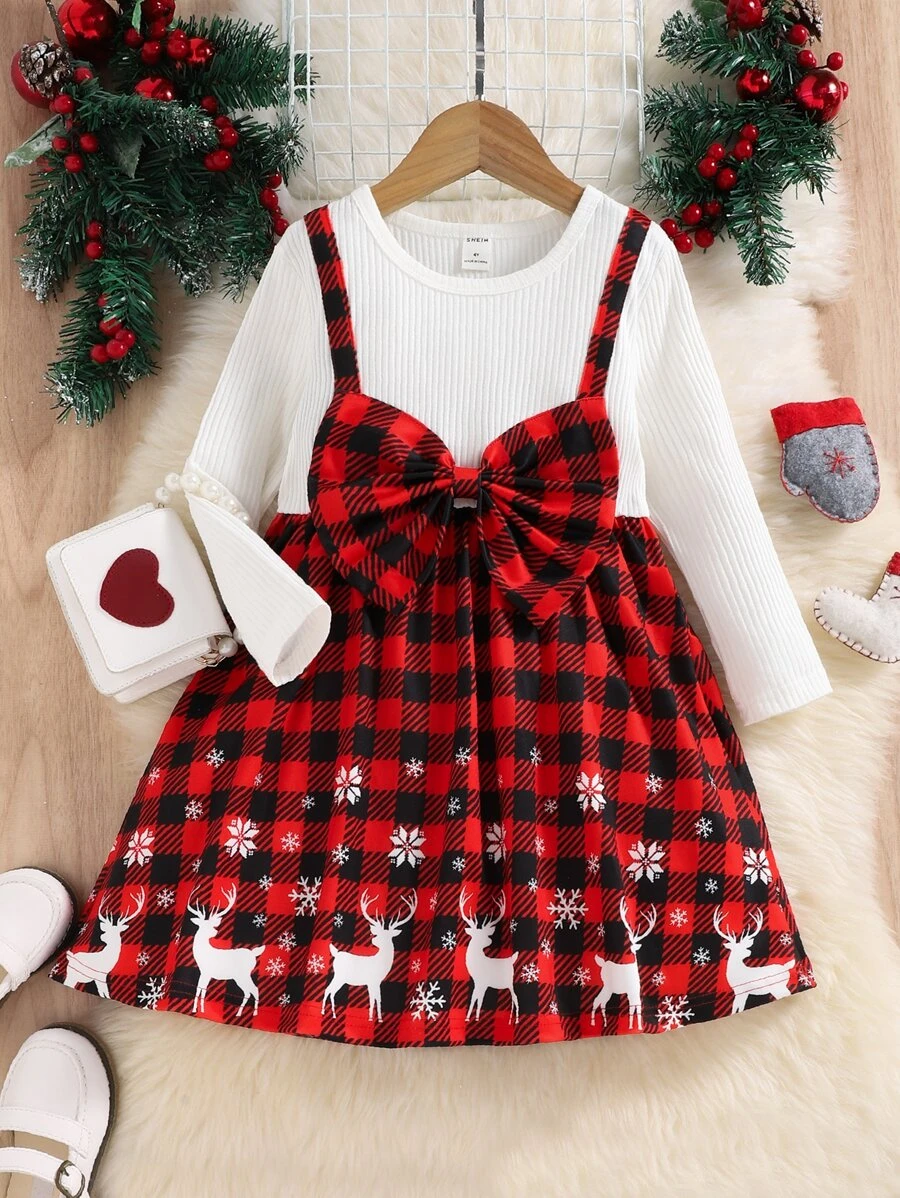เดรส เด็กเล็กผู้หญิง ลายคริสต์มาส และ ลายกิงแฮม แต่งโบว์หน้า 2 in 1 a-11