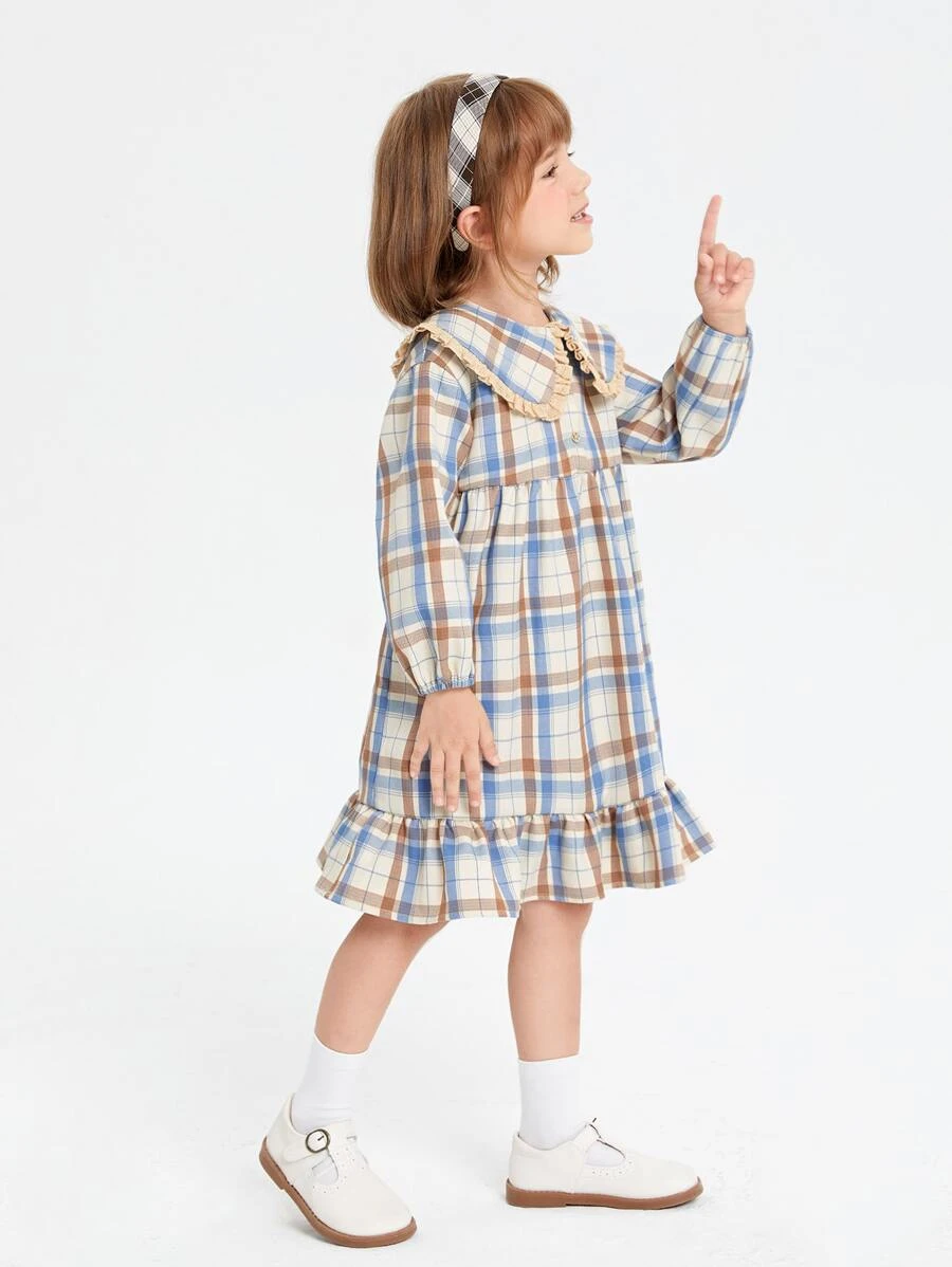 เด็กผู้หญิงวัยหัดเดิน เดรส ลายสก็อต ปกคอบัว ปลายระบาย a-36