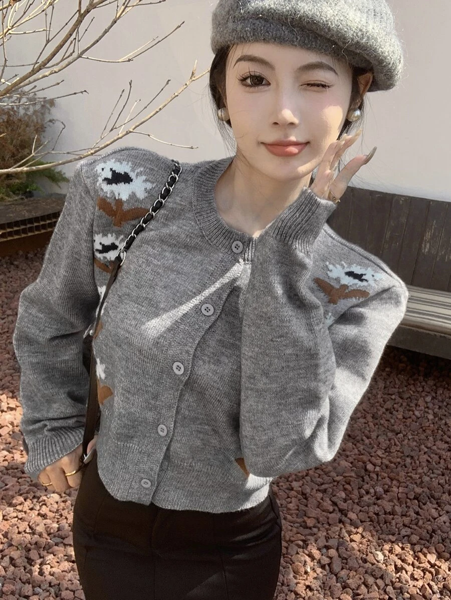 เสื้อคาร์ดิแกน ครอป ลาย ดอกไม้ กระดุมด้านหน้า i-58