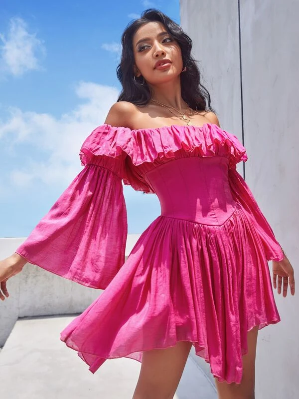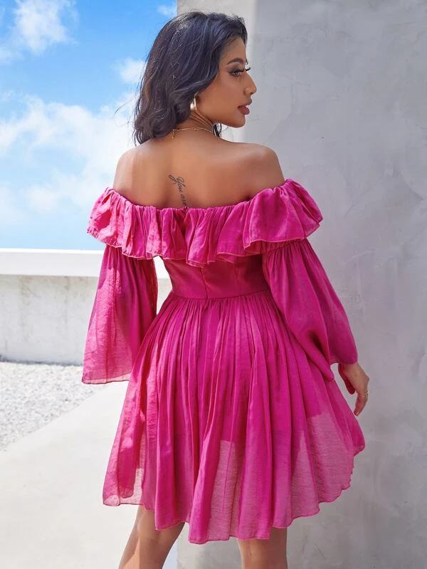 เดรส เปลือยไหล่ ขอบระบาย แขนระบาย d-8