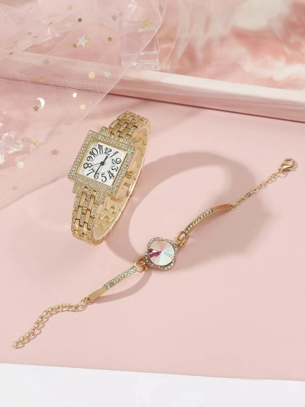 นาฬิกาข้อมือ เครื่องควอตซ์ 1 ชิ้น ติดเพชร หน้าปัดสี่เหลี่ยม และ สร้อยคอ 1 ชิ้น น-0158