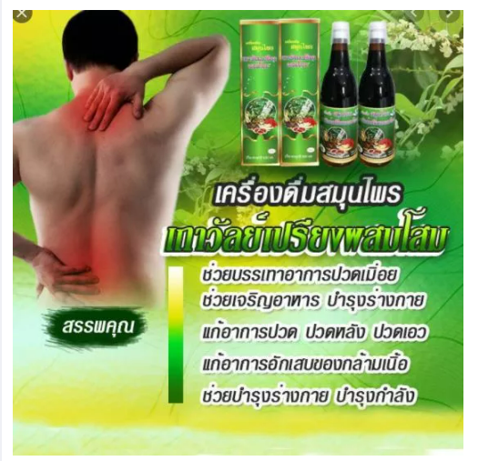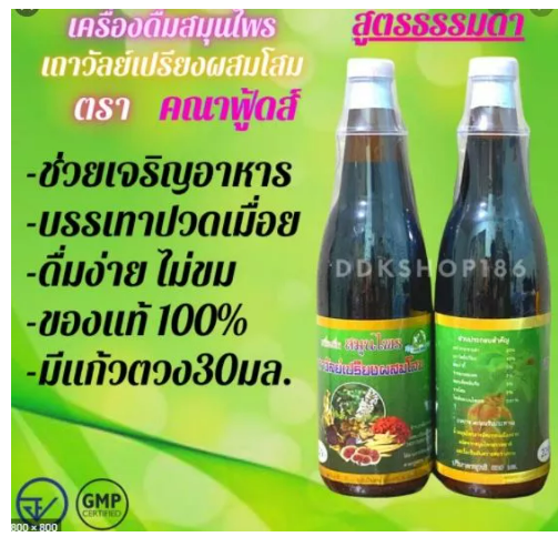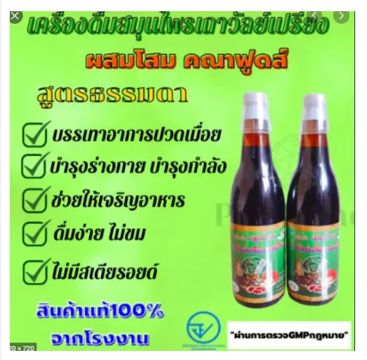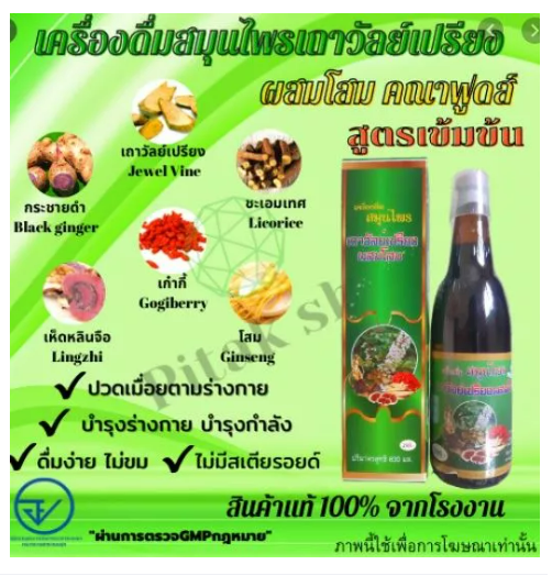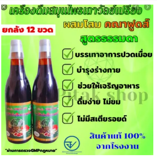 ส่วนประกอบสำคัญของน้ำสมุนไพร :1⃣กระชายดำ ⏩ ช่วยบรรเทาอาการปวดเมื่อยตามร่างกายเนื่องจากทำงานหนัก แก้ลมวิงเวียน2⃣เถาวัลย์เปรียง ⏩ เป็นสมุนไพรที่คนไทยใช้มาเนิ่นนาน เพื่อแก้อาการปวดเมื่อย ขับปัสสาวะ3⃣เก๋ากี๋ ⏩ ข่วยให้ระบบในร่างกายทำงานได้สมบูรณ์ขึ้น บำรุงร่างกายให้แข็งแรง4⃣ชะเอมเทศ ⏩ แก้น้ำลายเหนียว ช่วยให้ชุ่มคอ แก้เสมหะเป็นพิษ5⃣เห็ดหลินจือ ⏩ ช่วยบำรุงร่างกายเป็นยาอายุวัฒนะ6⃣โสม ⏩ ช่วยบำรุงกำลัง ช่วยแก้อาการเบื่ออาหาร ลดอาการอ่อนเพลียเครื่องดื่มนี้มีเครื่องหมาย อย. 40-1-10257-2-0008ผ่านการตรวจ GMP ตามกฎหมายไม่มีส่วนผสมของสารสเตียรอยด์คำเตือน : สตรีมีครรภ์ไม่ควรรับประทาน คนมีโรคประจำตัวควรปรึกษาแพทย์ก่อนรับประทานขนาดรับประทาน : รับประทานครั้งละ 30 มล. หลังอาหารเช้า หรือเย็น⏰1 ลัง (12 ขวด)