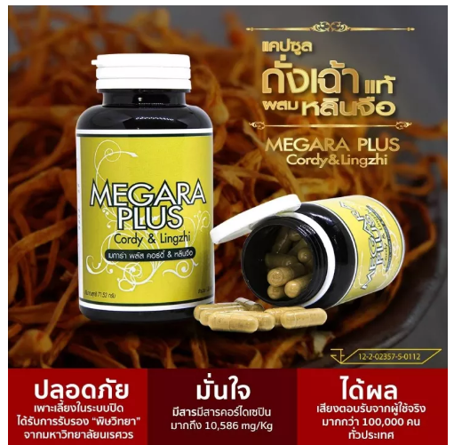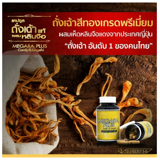 • ถั่งเช่าชั้นเลิศของแบรนด์ MEGARA PLUS Cordy & Lingzhi คือถั่งเช่าที่มีเห็ดหลินจือ เหมาะสำหรับทุกเพศทุกวัย