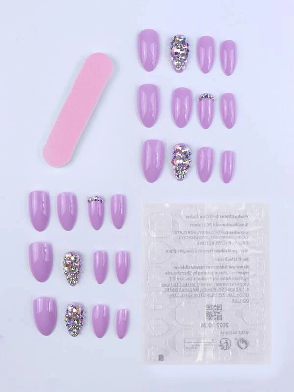 24 ชิ้น ยาว อัลมอนด์ 3D ตกแต่ง พลอยเทียม เล็บปลอม & เทปกาว 1 แผ่น & ตะไบเล็บ 1 ชิ้น c-85