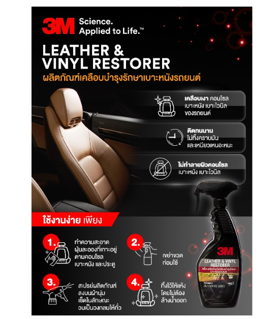 ? 3M Leather Vinyl Restorer น้ำยาเคลือบเงา เบาะ ไวนิลหนังแท้ หนังเทียม ขนาด400 ml PN39040LT (1 ขวด)