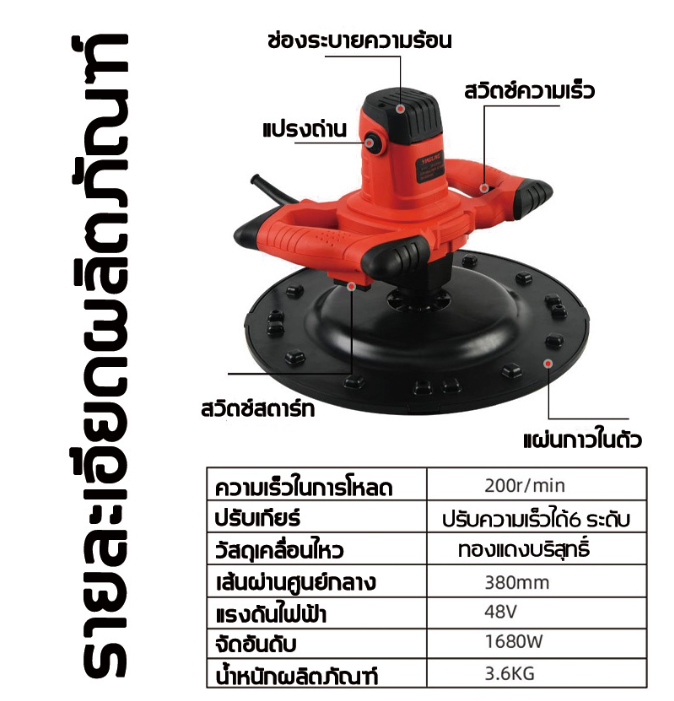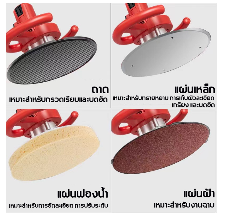 ?อุปกรณ์เครื่องปั่นผนังปูนฉาบ ขนาดแผ่นขัด 380mm 1.แผ่นพลาสติกขัดหยาบ 2.แผ่นฟองน้ำขัดละเอียด 3.แผ่นสแตนเลสขัดเรียบ 4.จานยึดแผ่นขัด 5.แผ่นขัดกระดาษทราย 6.ด้ามปั่นปูน