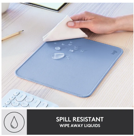 • ป้องกันการรั่วไหล แผ่นรองเมาส์ Logitech มีการเคลือบป้องกันการหกที่ทนทานต่ออุบัติเหตุโดยไม่ได้ตั้งใจ จึงสามารถเช็ดของเหลวออกได้อย่างง่ายดาย 1ผ่านการทดสอบภายใต้เงื่อนไขที่จำกัด เช็ดทำความสะอาดด้วยผ้าชุบน้ำหมาดๆ 2 นาที.