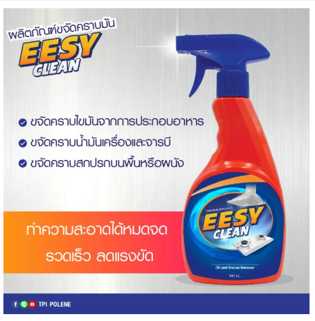 น้ำยาขจัดคราบมัน EESY CLEAN [EESY CLEAN by TPI - Grease Remover] เป็นผลิตภัณฑ์สำหรับขจัดคราบอเนกประสงค์ สามารถใช้ทำความสะอาดได้ทั้งคราบมันและไขมัน จากการประกอบอาหาร คราบน้ำมันเครื่อง คราบจาระบี หรือคราบสกปรกบนพื้น ประกอบด้วยสารทำความสะอาดที่มีประสิทธิภาพ ไม่เป็นอันตรายต่อผู้ใช้งาน จึงทำความสะอาดได้อย่างหมดจดรวดเร็ว ลดแรงขัด