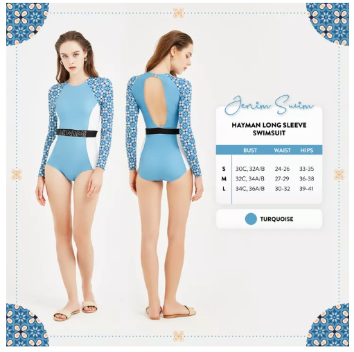 Specifications of Hayman Long Sleeve Swimsuit JenimSports ชุดว่ายน้ำวันพีชแขนยาว เว้าหลัง ผ้าพิมพ์ลายตรงแขนเสื้อ