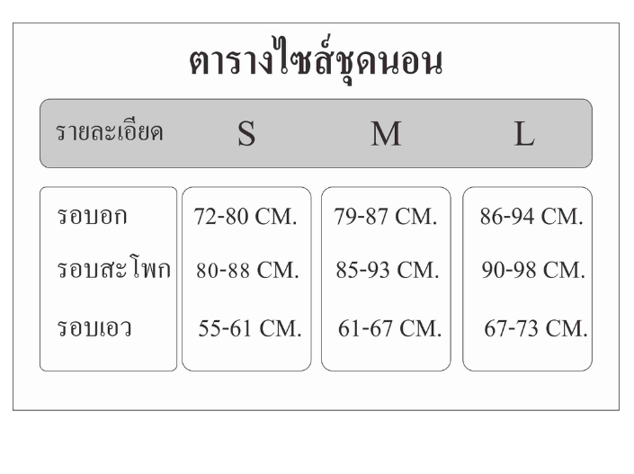 ขนาดสินค้า S , M , L ** รายละเอียดไซส์ดูจากตารางได้เลยค่ะ ***