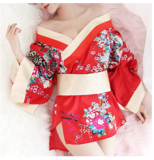 • ชุดกิโมโนผ้าซาติน สีแดง พิมพ์ลายดอกไม้ซากุระ