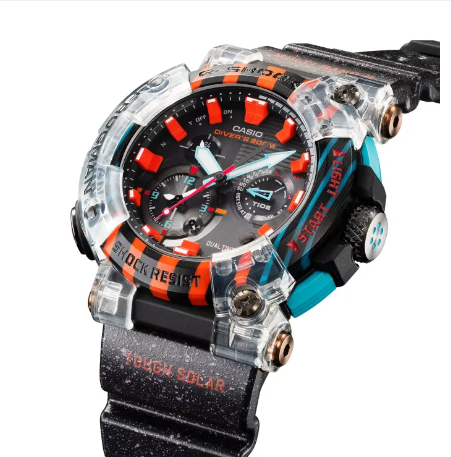 เข้าสู่การฉลองครบรอบ 30 ปีของนาฬิกา G-SHOCK Master ของตระกูล G FROGMAN นาฬิกาประดาน้ำที่กันน้ำลึกได้ถึง 200 เมตรตามมาตรฐาน ISO FROGMAN รุ่นแรกเป็นที่ฮือฮาอย่างมากเมื่อเปิดตัวครั้งแรกในปี 1993 ลิมิเต็ดเอดิชันรุ่นที่สองสำหรับการฉลองครบรอบ 30 ปี FROGMAN ในปี 2023 นำ GWF-A1000 ก้าวไปสู่อีกระดับ ด้วยการออกแบบพิเศษที่ได้รับแรงบันดาลใจจากกบลูกศรพิษ กรอบคาร์บอนหลากสีช่วยปลุกความแปลกประหลาดของเฉดสีของกบหายากสายพันธ์นี้อันมีสีสันสดใส ที่อาศัยอยู่ในป่าอเมซอน ทางใต้ของอเมริกา ตัดจากวัสดุพื้นฐานของคาร์บอนและไฟเบอร์ใยแก้วที่มีสีสันที่เคลือบเป็นลายสุ่ม ทำให้ไม่มีกรอบไหนเหมือนกัน สะท้อนให้เห็นถึงความหายากของกบสายพันธุ์นี้ กรอบที่รวมยูรีเทนแบบสีสันสดใสสะดุดตาและแบบโปร่งแสงให้ความรู้สึกเหมือนกบลูกศรพิษที่ชื่นชอบน้ำ สายพิมพ์ด้วยหมึกโพลาไรซ์คล้ายลายจุดของกบ เสริมด้วยรูปกบที่เป็นสัญลักษณ์ด้านหลังตัวเรือนเพื่อชวนให้นึกถึงรูปลักษณ์ของกบลูกศรพิษ