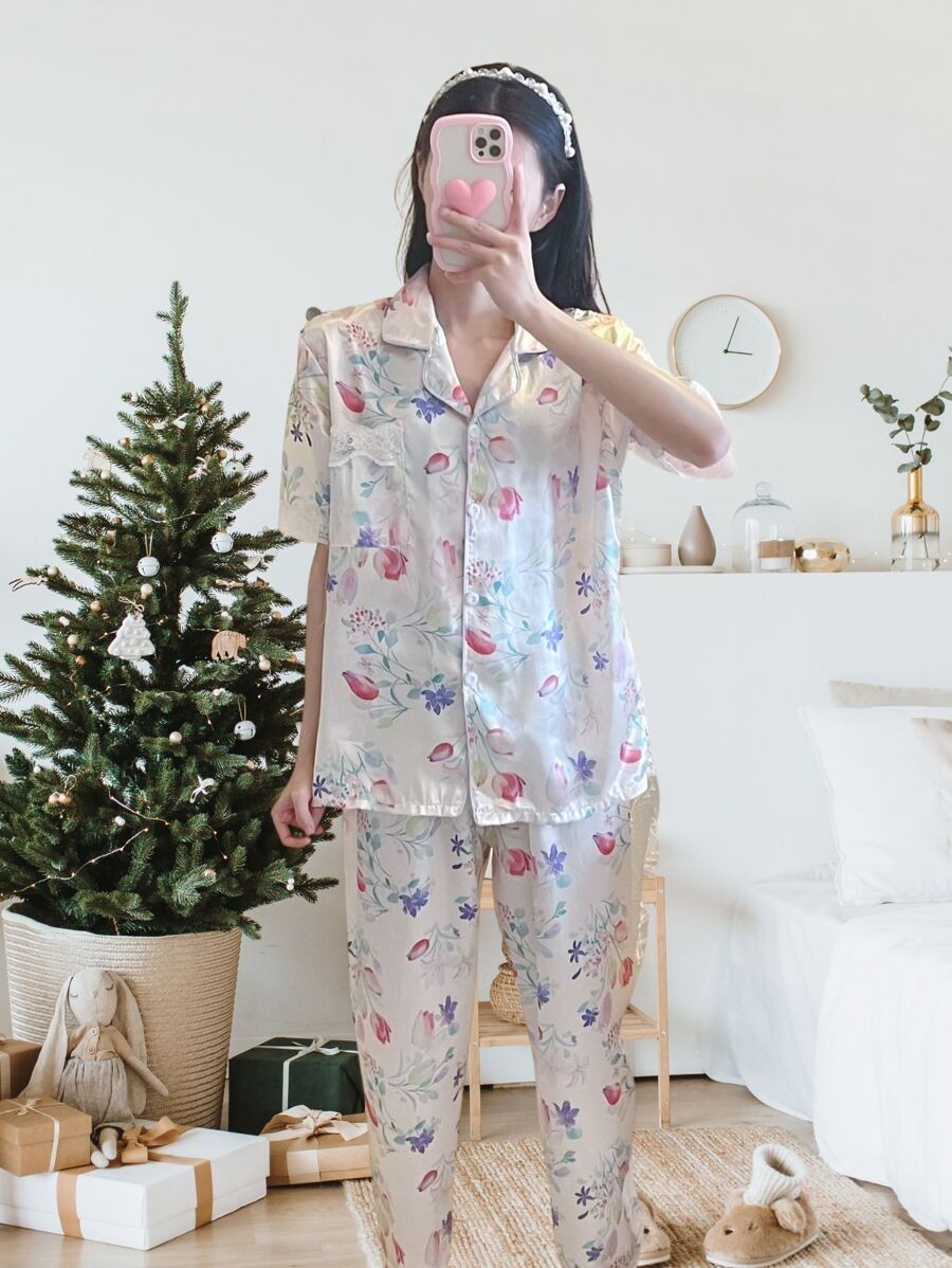 เซตชุดนอนผู้หญิง ชุดนอนผู้หญิง แขนสั้นขายาว ขอบลูกไม้ เรียบหรู ผ้าซาติน