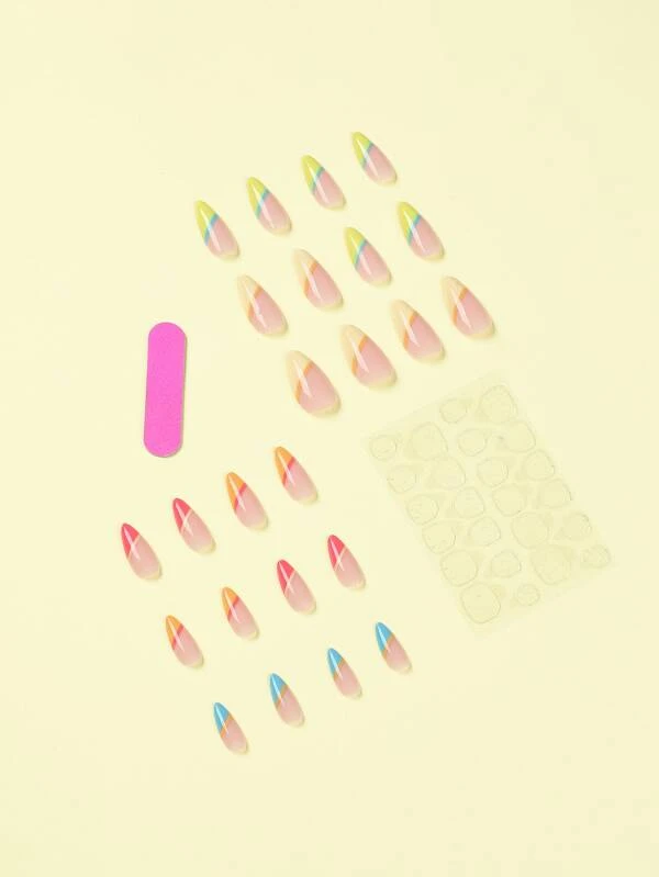 เล็บปลอม ยาว อัลมอนด์ บล็อคสี & เทปกาว 1 แผ่น & ตะไบเล็บ 1 ชิ้น 24 ชิ้น c-71