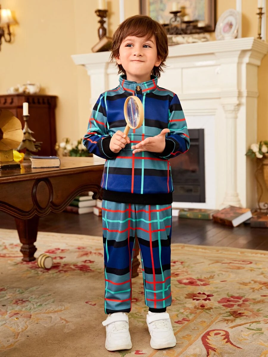เด็กผู้ชาย เสื้อสวมหัว & กางเกง ลายสก็อต กระดุมไตรมาส b-20