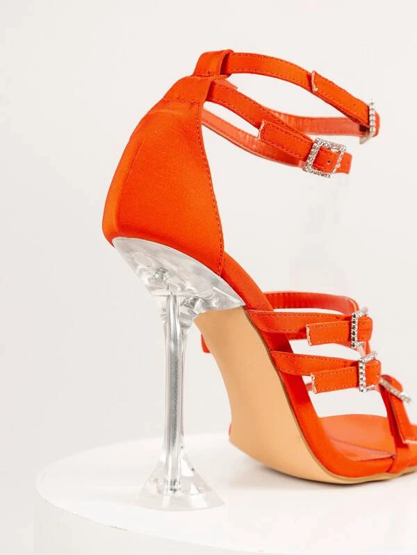 รองเท้าแตะส้นสูง โปร่งใส ทรงหัวเหลี่ยม พลอยเทียม รายละเอียด หัวเข็มขัด l-52