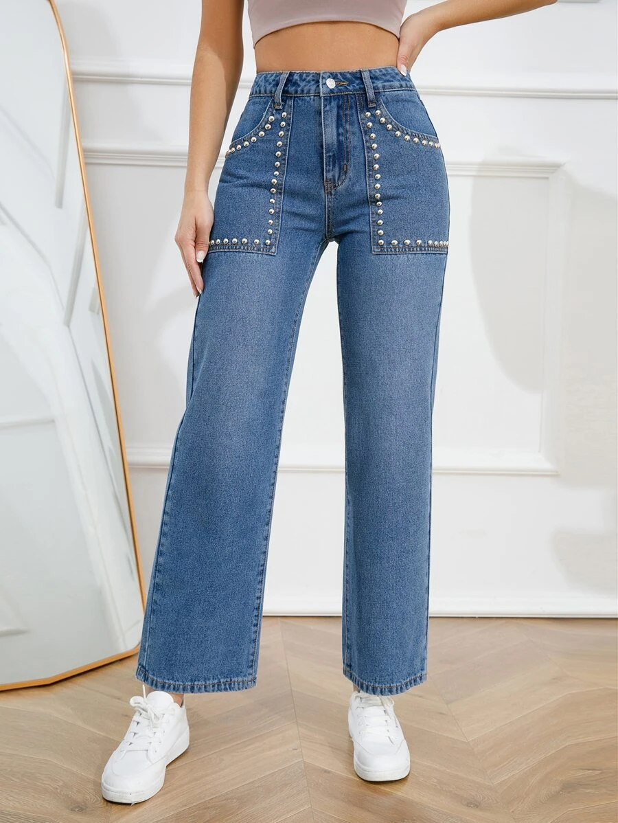 กางเกงยีนส์ ทรงตรง รายละเอียด หมุดย้ำ ee-86