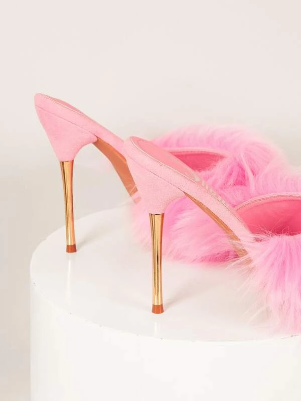 รองเท้าส้นสูง สายแต่งขน เปิดเท้า l-102