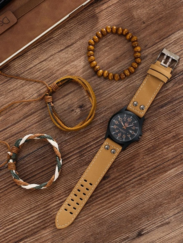 นาฬิกาควอทซ์ตัวชี้แบบกลมสำหรับผู้ชาย 1 เรือนและสร้อยข้อมือ 3 เม็ด น-196