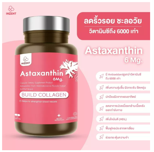 ส039 ส่งฟรี!! [1แถม1] INZENT ASTAXANTHIN 6 MG แอสตาแซนธิน 6 มก. (30 แคปซูล) แอสต้าแซนธีน แอสต้าแซนทีน สาหร่ายสีแดง ต้านอนุมูลอิสระ ชะลอวัย