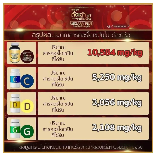 • ถั่งเช่าชั้นเลิศของแบรนด์ MEGARA PLUS Cordy & Lingzhi คือถั่งเช่าที่มีเห็ดหลินจือ เหมาะสำหรับทุกเพศทุกวัย