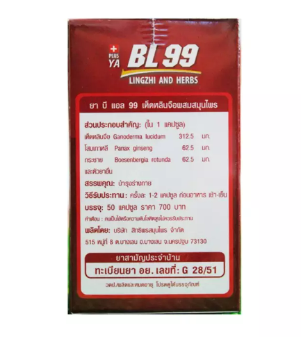 BL99 บีแอล99 เห็ดหลินจือ อาหารเสริมเพื่อสุขภาพเห็ดหลินจือ BL99 บีแอล99 ของแท้ ราคาถูก สรรพคุณสมุนไพรอาหารเสริมสุขภาพ เห็ดหลินจือแดงผสมสมุนไพร เห็ดหลินจือ BL99 บีแอล99ช่วยบำรุงร่างกาย ทำให้สุขภาพร่างกายดีขึ้น อวัยวะต่างๆทำงานได้ปกติ โดยเฉพาะผู้ป่วยที่กำลังพักฟื้น หรือ ร่างกายอ่อนแอ จะฟื้นฟูสภาพร่างกายได้เร็วขึ้น ร่างกายจะแข็งแรงขึ้น การรักษาจะได้ผลลัพธ์ที่ดี ช่วยบำบัดฟื้นฟูสุขภาพจากโรคภัยต่างๆ เช่น โรคภูมิแพ้ ไทรอยด์ โรคมะเร็ง โรคเบาหวาน โรคความดันโลหิตสูง โรคปอด โรคตับแข็ง โรคไต โรคผิวหนัง ช่วยให้ผิวขาว ผิวพรรณสดใสเปล่งปลั่ง ล้างพิษลำไส้ใหญ่ ช่วยให้ระบบขับถ่ายดีขึ้น รักษาโรคริดสีดวงทวาร โรคต่อมลูกหมากโต ปวดท้องประจำเดือน โรคเก๊าต์ ไมเกรน ลดการอักเสบต่างๆในร่างกาย เสริมสร้างภูมิคุ้มกัน ปรับสมดุลย์ร่างกาย เป็นต้นส่วนประกอบในBL99(บีแอล99)- เห็ดหลินจือ Ganoderma Luxidum 312.50 mg.- โสมเกาหลี Panax Ginseng 62.50 mg.- กระชาย Boesenbergia Rotunda 62.50 mg.- ตัวยาอื่นๆประโยชน์ที่มีอยู่ในเห็ดหลินจือช่วยในการป้องกัน รักษา และบรรเทาโรคต่างๆดังนี้- ต่อต้านมะเร็ง, ลดอันตรายจากการใช้เคมีบำบัด- ภูมิต้านทานของร่างกายดีขึ้น, ลดภูมิแพ้, หอบหืด- ควบคุมเบาหวานได้, ช่วยให้แผลหายเร็ว- โรคสะเก็ดเงิน โรคหอบหืด โรคริดสีดวง- ฆ่าเชื้อรา ไวรัส โดยเฉพาะในผู้ป่วยเอดส์ ช่วยให้เม็ดเลือดขาว ที และบี เซล สูงขึ้น ไม่ติดเชื้อฉวยโอกาส- รักษามะเร็งเต้านม,มะเร็งตับได้,บำรุงตับ, ใช้ประกอบการรักษาตับอักเสบ- ลดและป้องกันเส้นเลือดอุดตัน ซึ่งเป็นสาเหตุหนึ่งของอัมพฤกษ์ อัมพาต- ช่วยให้การบีบตัวของหัวใจมีประสิทธิภาพมากขึ้น- ให้วิตามินเกลือแร่,จับแคลเซียมเข้ากระดูก,ช่วยให้เซลร่างกายสดชื่น,ชะลอความแก่- ป้องกันและฟื้นฟูอัลไซด์เมอร์,ระบบประสาททำงานดีขึ้น- ต้านอนุมูลอิสระ ที่ทำให้เซลเสื่อม, ก่อโรค, และแก่เร็ว- ลดความเครียด ความกดดันทางจิตใจ ทำให้นอนหลับได้ดีขึ้น- ล้างพิษสะสมของยาแผนปัจจุบัน สามารถใช้ร่วมกับยาแผนปัจจุบันได้อย่างปลอดภัย- โรคความดันโลหิตสูงและความดันโลหิตต่ำ ทำให้เลือดไปเลี้ยงเซลล์สมองได้ดีขึ้น- โรคผิวหนัง โรคหัวใจ- ทำให้ตับ ไต ทำงานเป็นปกติ- โรคภมิแพ้ โรคไซนัส โรคไขข้ออักเสบ โรคSLE- โรคไขมันในเลือดสูง กำจัดโลหะหนักในหลอดเลือด- หยุดปัญหาผมร่วง ทำให้ผมดกดำ ถ้าหัวล้านผมจะขึ้นใหม่- ต่อต้านอนุมูลอิสระ- ภาวะโลหิตจาง โรคซีด เลือดน้อยแก้ภาวะกรดไหลย้อน- กระตุ้นให้ระบบในร่างกายทำงานปกติ ทำให้ร่างกายแข็งแรง- ควบคุมระบบไหลเวียนโลหิต แก้โรคมือ-เท้า ชา- ชลอการแก่ชรา บำรุงผิวหน้าช่วยให้ผิวพร