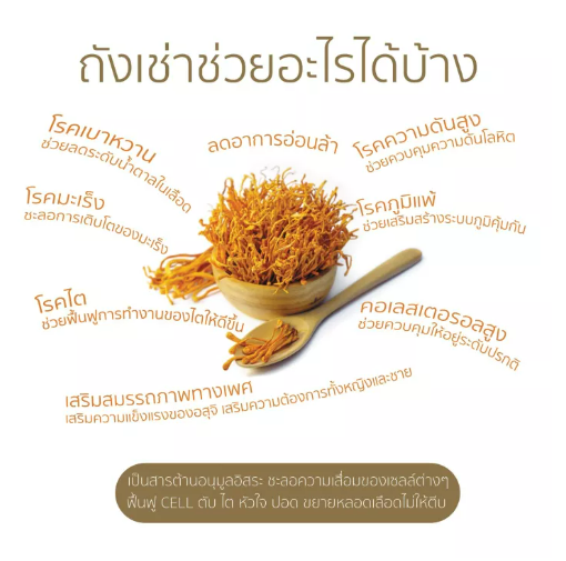คุณสมบัติโดดเด่น • บำรุงกำลังและบำรุงร่างกาย ทำให้เลือดไหลเวียนสะดวก ลดลิ่มเลือด มีเรี่ยวแรงมากขึ้น • ช่วยเปิดระบบทางเดินหายใจ ทำให้หายใจได้คล่องขึ้น ลดอาการอักเสบจากภูมิแพ้ • มีฤทธิ์กระตุ้นฮอร์โมน ช่วยควบคุมน้ำตาลในเลือดและคอเลสเตอรอลในผู้ป่วยเบาหวาน • ช่วยกระตุ้นระบบภูมิคุ้มกัน ลดอาการอักเสบ ทำให้เจ็บป่วยยากขึ้น และหายจากอาการป่วยไวขึ้น • ช่วยบำรุงตับและไต ลดอาการตับแข็ง ตับอักเสบ โรคไตเรื้อรัง ช่วยให้การทำงานของไตดีขึ้น • ช่วยปรับระบบฮอร์โมนเพศในคนที่ฮอร์โมนไม่ปกติ เช่น ปวดประจำเดือน ประจำเดือนมาไม่ปกติ • ช่วยบำรุงกำลัง บำรุงร่างกาย ให้ร่างกายแข็งแรง มีพละกำลัง พร้อมบำรุงระบบหายใจ ลดอาการหอบหืด ภูมิแพ้ บำรุงตับ ไต และต้านอนุมูลอิสระ • สารสกัดจากถั่งเฉ้า ราชาแห่งสมุนไพรจีน ช่วยกระตุ้นระบบภูมิคุ้มกัน และระบบภายในร่างกายให้ทำงานได้มีประสิทธิภาพดีขึ้น • ช่วยบำรุงกำลัง บำรุงร่างกาย ทำให้ร่างกายแข็งแรง มีพละกำลัง บำรุงระบบหายใจ ลดอาการหอบหืด ภูมิแพ้ บำรุงตับและไต ต้ • ต้านอนุมูลอิสระ เพิ่มภูมิต้านทาน ส่งผลให้ร่างกายโดยรวมแข็งแรง • เหมาะสำหรับผู้ที่อ่อนเพลีย ผู้ป่วยพักฟื้น นักกีฬาและผู้ที่ต้องใช้พละกำลัง • บรรเทาอาการหลังหมดประจำเดือน นอกจากนี้ในเพศชายยังทำให้สเปิร์มมีชีวิตอยู่ได้นานขึ้น • บำรุงระบบหายใจ ลดอาการหอบหืด • ต้านอนุมูลอิสระและเชื้อโรค เพิ่มภูมิต้านทาน ต้านการอักเสบ บรรเทาอาการหวัด ภูมิแพ้ • ควบคุมระดับน้ำตาลและคอเลสเตอรอลในเลือด • บำรุงตับและไต ลดอาการจากไตวายเรื้อรัง • สำหรับสตรี ปรับประจำเดือน บำรุงเลือด ช่วยให้มีบุตรง่ายขึ้น