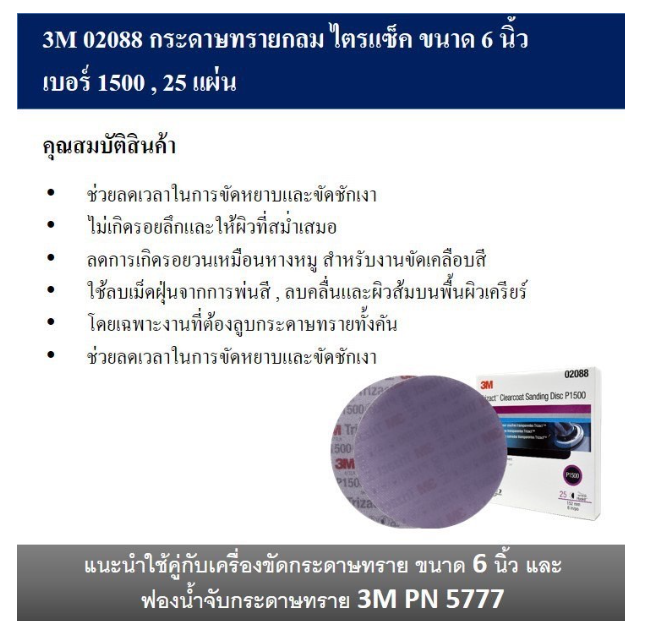 แนะนำใช้คู่กับเครื่องขัดกระดาษทราย ขนาด 6 นิ้ว และฟองน้ำจับกระดาษทราย 3M PN 5777