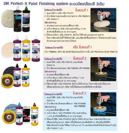 ในชุดประกอบด้วย ยาขัดเบอร์ 36060 6064 6068 ฟองน้ำ 8นิ้ว สีขาว ดำ ฟ้า อย่างละแผ่นและ ผ้าไมโครไฟเบอร์ 3เอ็ม 1 ผืน36060เป็นขั้นตอนแรกเพื่อการปรับสภาพเคลียร์หรือลบรอยกระดาษทรายเบอร์ละเอียด โดยใช้ลูกขัดขนแกะ 3M 5701 หรือฟองน้ำสีขาว 3M 05723 พร้อมน้ำยาขัดหยาบ เหมาะสำหรับสภาพรถที่ใช้มานานและมีร่องรอยขีดข่วนลึก หรือว่าร่องรอยที่เกิดจากกระดาษทรายเบอร์ 1500 ขึ้นไป ให้จางหายไปและปรับสมดุลพื้นผิวสีและผิวแลคเกอร์ให้กลับมา แต่อาจจะยังทิ้งร่องรอย โดยน้ำยาขัดนี้จะต้องใช้ควบคู่กับลูกขัดขนแกะ หรือฟองน้ำสีขาวเท่านั้น น้ำยาขัดลงเร็วและมีความเงา สูตรน้ำ 100% วิธีการใช้งาน - ควรเขย่าก่อนใช้งาน เพื่อให้น้ำยาไม่นอนก้น, หยดน้ำยาลงลูกขัดขนแกะ หรือว่า บนตัวรถ ก็ได้ ฝากระโปรงรถใช้ประมาณ 4 - 6 หยด, ข้ดด้วยเครื่อง Rotary รอบควรอยู่ต่ำสุด 1,200 RPM และไม่เกิน 2,500 RPM วนไปเรื่อยๆ จนตัวน้ำยาหายไปจนหมด6094 เป็นขั้นตอนที่สองสำหรับชักเงาเคลียร์โดยใช้ลูกขัดฟองน้ำดำ 3M 05725 เหมาะสำหรับสภาพรถ ใช้งานมาได้ไม่นาน ใช้ขัดลบรอยวนที่เกิดจาก #1 และร่องรอยขนแมว สามารถชักเงาผิวสี และลบรอยวนจากขนแกะโดย หลังจากใช้แล้ว รอยกระดาษทรายและร่องรอยขนแมวจะหมดไปและให้ความเงาไปในตัว เท่านั้น น้ำยาขัดลงเร็วและมีความเงา สูตรน้ำ 100% วิธีการใช้งาน - ควรเขย่าก่อนใช้งาน เพื่อให้น้ำยาไม่นอนก้น, หยดน้ำยาลงบนฟองน้ำสีดำ หรือว่า บนตัวรถ ก็ได้ ฝากระโปรงรถใช้ประมาณ 4 - 6 หยด, ข้ดด้วยเครื่อง Rotary รอบควรอยู่ต่ำสุด 1,200 RPM และไม่เกิน 2,500 RPM วนไปเรื่อยๆ จนตัวน้ำยาหายไปจนหมด
