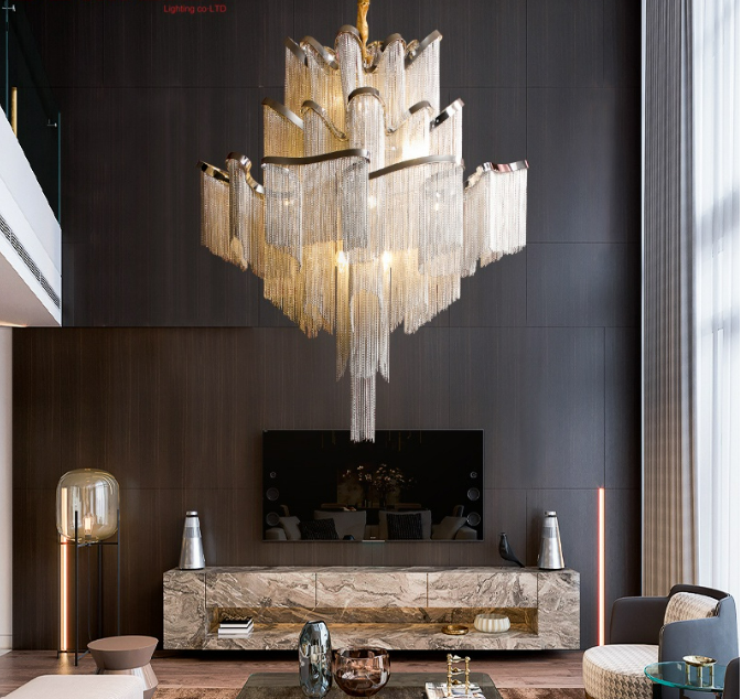 (F-003) คมไฟแขวน 3 ชั้น อลูมิเนียม พู่โซ่ ชุบโลหะ สไตล์โมเดิร์น สีเงิน / S ทอง / ดํา สําหรับห้องนั่งเล่น
