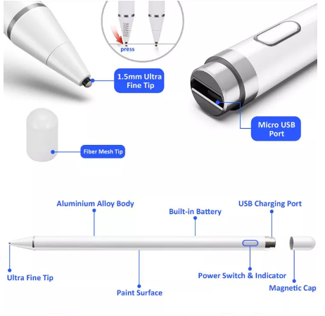 ข้อมูลเฉพาะของ ปากกาไอแพด Capacitive ปากกาสไตลัส ปากกาทัชสกรีน ปากกาเขียนหน้าจอ สำหรับ ไอโฟน iPad 9.7 2018 มินิ 1 2 3 4 Pro Air VIVO OPPO,Samsung,Huawei,Xiaomi Huawei หรือแท็บเล็ตได้หมด