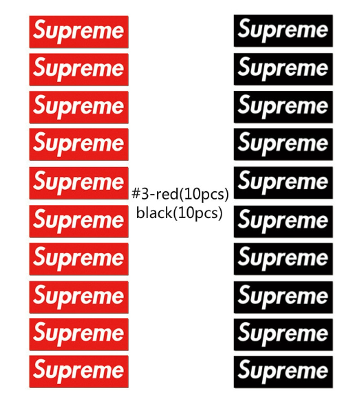 Name: supreme sticker Material: sticker Size: 9.2*3cm Type: Car sticker Color: red (20PCS), black (20PCS)