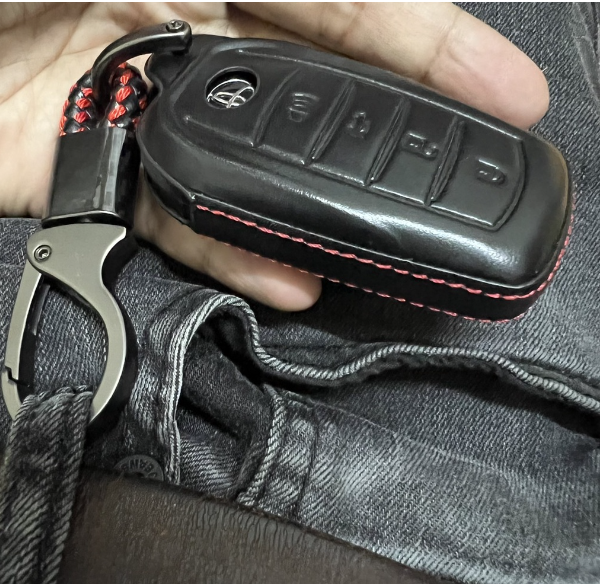เคสหนังรีโมทรถ Toyota Fortuner Leader แบบ 4 ปุ่ม Fortuner GR Sport, Legender 2022 งานหนังด้ายแดง (Leather Key Case Key) พร้อมพวงกุญแจคล้องหูกางเกงหัวโลหะหมุนได้ 360 องศา) ผิวสัมผัสนุ่ม งานประณีต เข้ารูป เพิ่มความสวยงาม และปกป้องรีโมท ทำให้รีโมทรถยนต์คุณใหม่ตลอดเวลา ป้องกันการกระแทกได้เป็นอย่างดี ช่วยถนอมปกป้องไม่ให้รีโมทเป็นรอยขีด ข่วน หรือกระแทกเสียหาย พร้อมแพ็คเกจและพวงกุญแจคล้องหูกางเกาง วัสดุโลหะอัลลอย แข็งแรง สวยงาม
