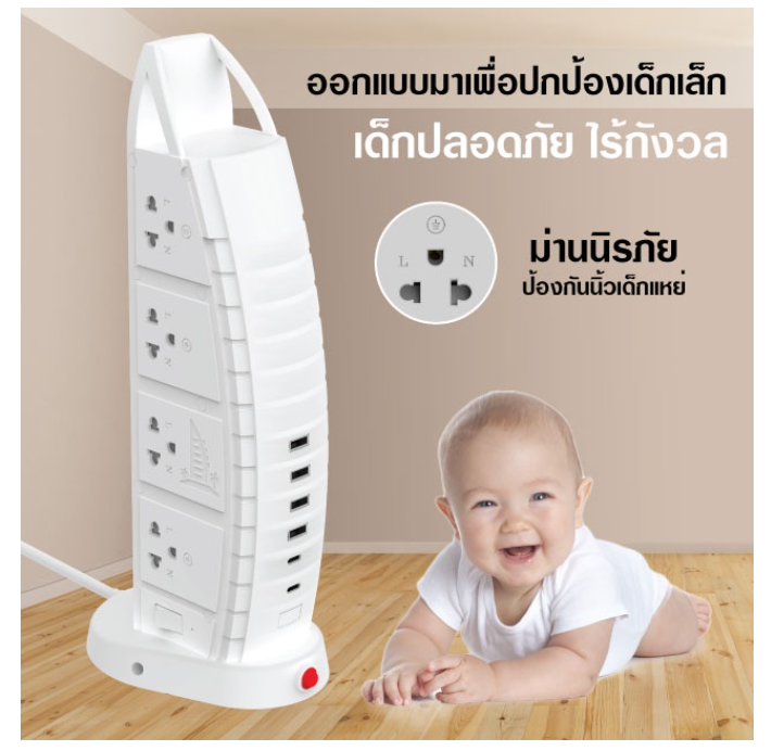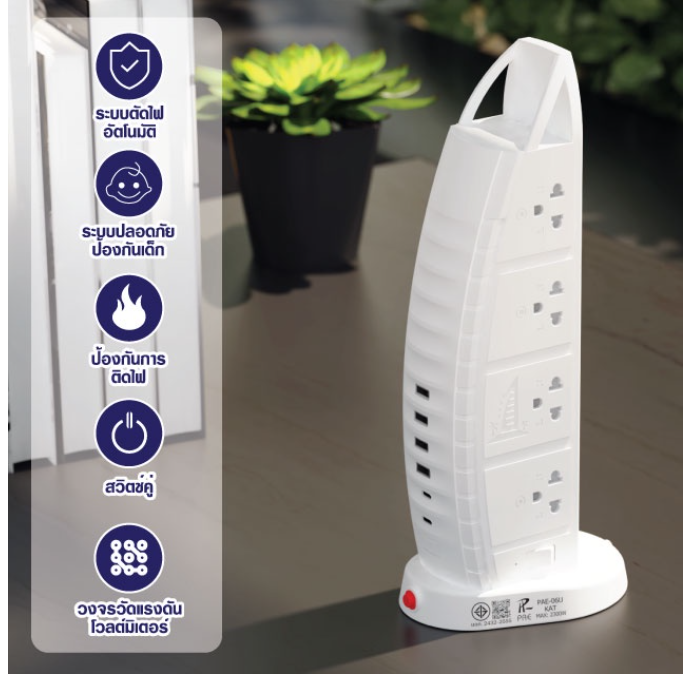 ** รายละเอียดรุ่น PAE-06U - การออกแบบใหม่ ทรงสวยดูดี ทันสมัย ทรงเรือใบ - ช่องปลั๊ก 8 ช่อง / USB 4 ช่อง / TYPE-C 2 ช่อง - MAX 2300W 250V - สวิตช์เปิด/ปิด 2 ฝั่ง - มีปุ่มรีเซ็ตโอเวอร์โหลด - มี มอก. รองรับความปลอดภัย