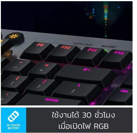 • เพลิดเพลินกับเวลาเล่นเกม 30 ชั่วโมงด้วยการชาร์จครั้งเดียว คำเตือนแบตเตอรี่เหลือน้อยที่ 15% บน LED แบตเตอรี่ของคีย์บอร์ดและผ่านการแจ้งเตือนแบบป๊อปอัปในซอฟต์แวร์ Logitech G HUB ชาร์จอย่างรวดเร็วใน 3 ชั่วโมง