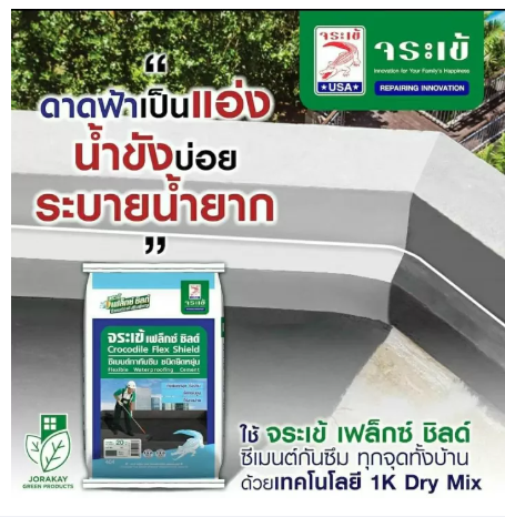 จระเข้เฟล็กช์ชิลด์เป็นซีเมนต์ทากันซึมชนิดยืดหยุ่น แบบส่วนผสมเดียว ใช้งานง่ายเพียงผสมน้ำ ทนต่อสภาวะอากาศได้ดี ปล่อยเปลือยได้ ทนรังสี UV มีคุณสมบัติในการปิดรอยร้าวได้ดี สามารถใช้ในพื้นที่ที่มีโอกาส ขยับเคลื่อนไหว ผิวงานที่เสร็จแล้วมีความคงทน ไม่หลุดล่อน มีแรงยึดเกาะที่ดี ไม่มีสารพิษการเตรียมพื้นผิว