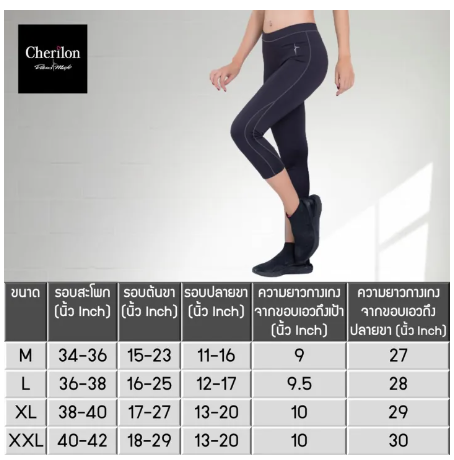 Cherilon เชอรีล่อน กางเกงออกกำลังกาย สกินนี่ 4 ส่วน ผ้านุ่ม ยืดหยุ่น คืนตัวได้ดี ระบายอากาศดี ลดกลิ่นอับชื้น สีดำ MPN-PCA110-BL ? ผลิตจากผ้า Polyamide ผสม Spandex เนื้อผ้ามีความนุ่ม ยืดหยุ่น และคืนตัวได้ดี ช่วยให้การออกกำลังกายมีความคล่องตัว ? ผ้าระบายอากาศดี ลดกลิ่นอับชื้น ทำให้รู้สึกสบายตัวขณะสวมใส่ออกกำลังกาย ขนาด: M รอบสะโพก 34-36 นิ้ว ความยาวกางเกง 27 นิ้ว L รอบสะโพก 36-38 นิ้ว ความยาวกางเกง 28 นิ้ว XL รอบสะโพก 38-40 นิ้ว ความยาวกางเกง 29 นิ้ว XXL รอบสะโพก 40-42 นิ้ว ความยาวกางเกง 30 นิ้ว วิธีการดูแลรักษาผลิตภัณฑ์ : ? ควรซักด้วยมือ และน้ำยาซักผ้าชนิดอ่อน ? หลีกเลี่ยงการซักด้วยผลิตภัณฑ์ซักล้างที่มีส่วนผสมของสารฟอกขาว ? ไม่ควรซักผ้าสีอ่อนรวมกับผ้าสีเข้ม ? ควรตากในที่ร่ม หรือมีลมโกรก ? ควรหลีกเลี่ยงแสงแดดจัด เพื่อถนอมสีของผลิตภัณฑ์ให้ยาวนาน ? คำแนะนำเพิ่มเติมอื่นๆ ระบุในเอกสารหรือป้ายของแต่ละผลิตภัณฑ์ หมายเหตุ : สีของผลิตภัณฑ์ที่แสดงบนเว็บไซด์ หรือแอพพลิเคชั่นบนอุปกรณ์สื่อสาร อาจมีความแตกต่างกัน จากการตั้งค่าการแสดงผลของแต่ละหน้าจอ ? หมายเหตุ : กรุณาอ่านให้ละเอียดก่อนทำการสั่งซื้อ ? ผู้ซื้อไม่อาจยื่นคำร้องขอคืนสินค้าและ/หรือคืนเงิน เนื่องจากเปลี่ยนใจ หรือได้ทดลองสวมใส่แล้ว ? การเปลี่ยนสินค้า เนื่องจากร้านส่งสินค้าผิดไปจากที่ระบุในคำสั่งซื้อ สินค้าที่ส่งผิดไปนั้นต้องอยู่ในสภาพยังไม่ได้ทดลองสวมใส่ และ/หรือยังไม่ได้ใช้งาน โดยมีป้ายสินค้า และป้ายราคา ติดอยู่ในสินค้า ครบถ้วน ตลอดรวมถึงสินค้าต้องใส่ถุงหรือกล่อง แบรนด์ Cherilon ครบถ้วน ? เพื่อสะดวกในการตรวจสอบกรณีมีปัญหาเกี่ยวกับสินค้าที่คุณลูกค้าได้รับ ขอให้คุณลูกค้าถ่าย VDO บันทึกการเปิดถุง / กล่องบรรจุสินค้า ทุกครั้ง สำหรับนำเป็นหลักฐานอ้างอิงการเคลม (Claim) สินค้า **************************** NOTE: ภาพและข้อความผลิตภัณฑ์ สงวนสิทธิ์เฉพาะผลิตภัณฑ์ Cherilon แท้ เท่านั้น (ผลิตภัณฑ์ Cherilon แท้ สังเกตง่ายๆจาก (1) ป้ายและบรรจุภัณฑ์ของผลิตภัณฑ์ ระบุแบรนด์ Cherilon ชัดเจน (2) มีจำนวนป้ายผลิตภัณฑ์ครบถ้วน (3) ป้ายและบรรจุภัณฑ์ของผลิตภัณฑ์อยู่ในสภาพปกติ ทั้งนี้หากมีข้อสงสัยเกี่ยวกับผลิตภัณฑ์ โปรดติดต่อ ศูนย์ลูกค้าสัมพันธ์ LINE : @shopAtAnywhere