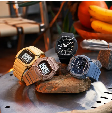 Welcome to the Tone-on-Tone G-SHOCK — the perfect watch for the latest fashions in popular monochromatic color schemes. Natural colors with a matte finish are subtly accentuated by metallic face protectors in matching tones. The wire face protectors are a first ever for the 2100 line. Choose from three models: the ever-popular angular DW-5600, the round-case DW-5700, and the GA-2100 with octagonal bezel.